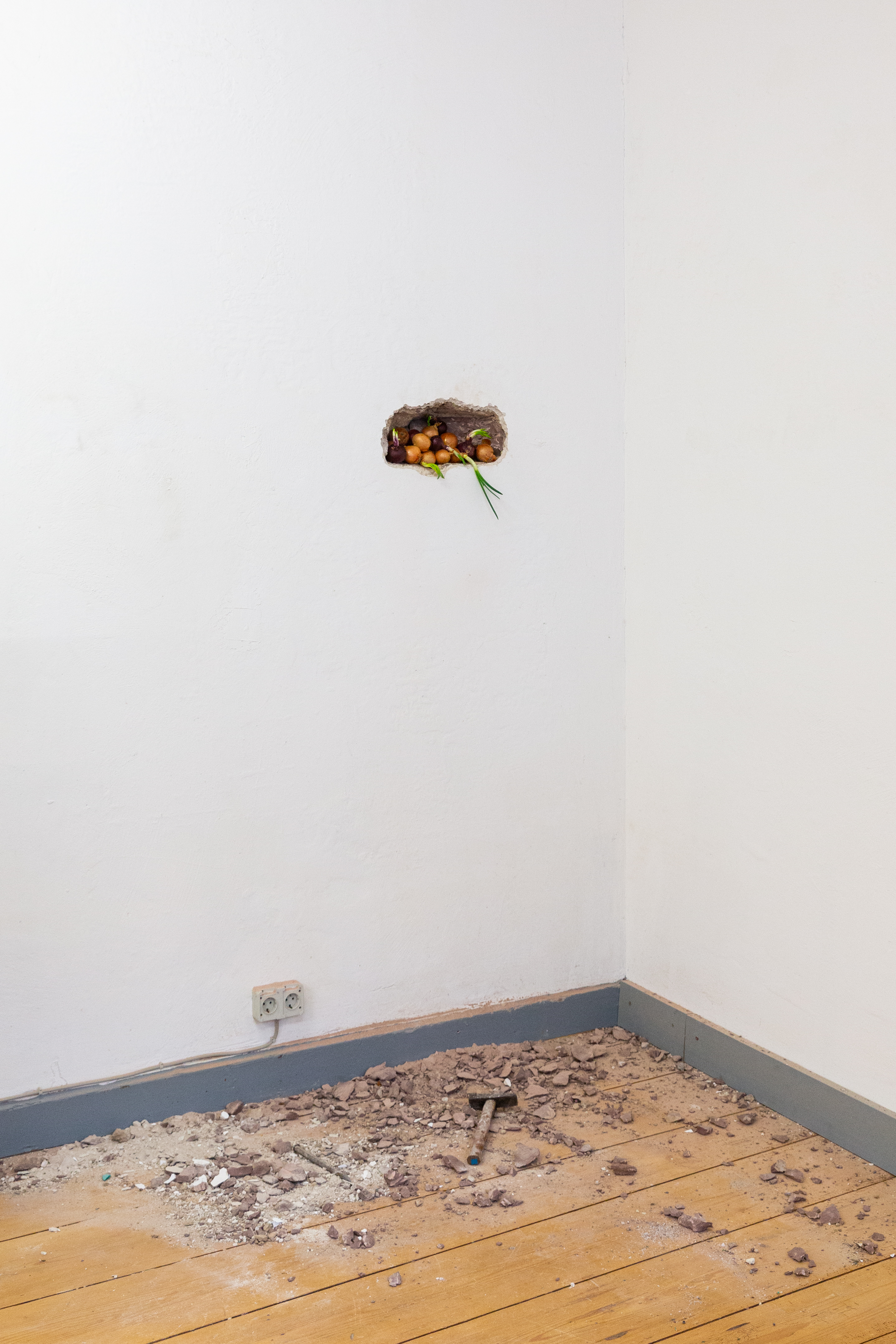 We approached the subject of DIY from a different angle: Our object does not consist of purchased or found materials, but makes use of the immediate environment: a hole in the wall as an increase in the volume of your own four walls and shelf space for everyday things. The only tool used is a hammer.